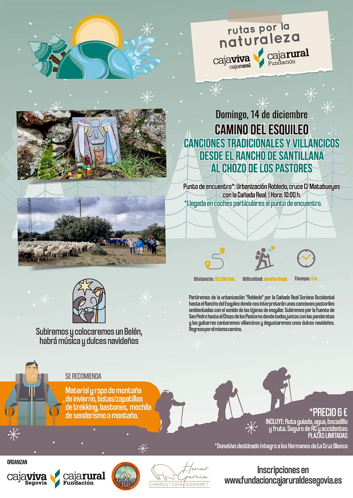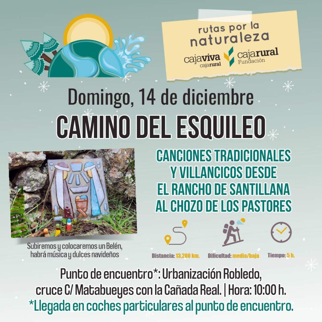 Partiremos a las 10:00h de la urbanización “Robledo” por la Cañada Real Soriana Occidental hasta el Rancho del Esquileo donde nos interpretarán unas canciones pastoriles ambientadas con el sonido de las tijeras de esquilar. Subiremos por la Fuente de San Pedro hasta el Chozo de los Pastores donde todos juntos con las panderetas y las guitarras cantaremos villancicos y degustaremos deliciosos dulces navideños. Regreso por el mismo camino.