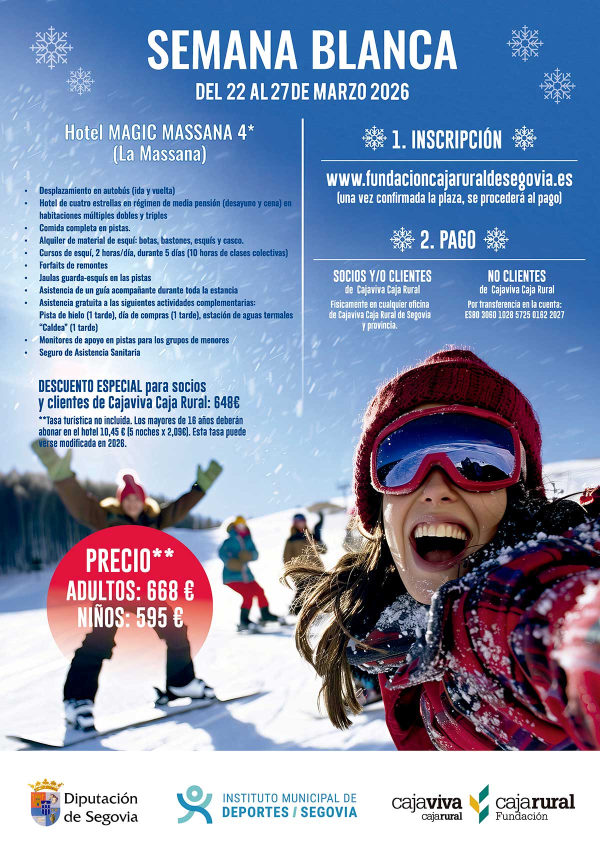 La Semana Blanca está dirigida a escolares nacidos entre 2008 y 2013, así como a mayores de 18 años, todos ellos residentes en la provincia. El precio de la actividad es de 595 euros para menores y 668 euros para adultos, con un descuento de 20 euros para socios y clientes de Cajaviva Caja Rural que realicen el pago en una oficina física.